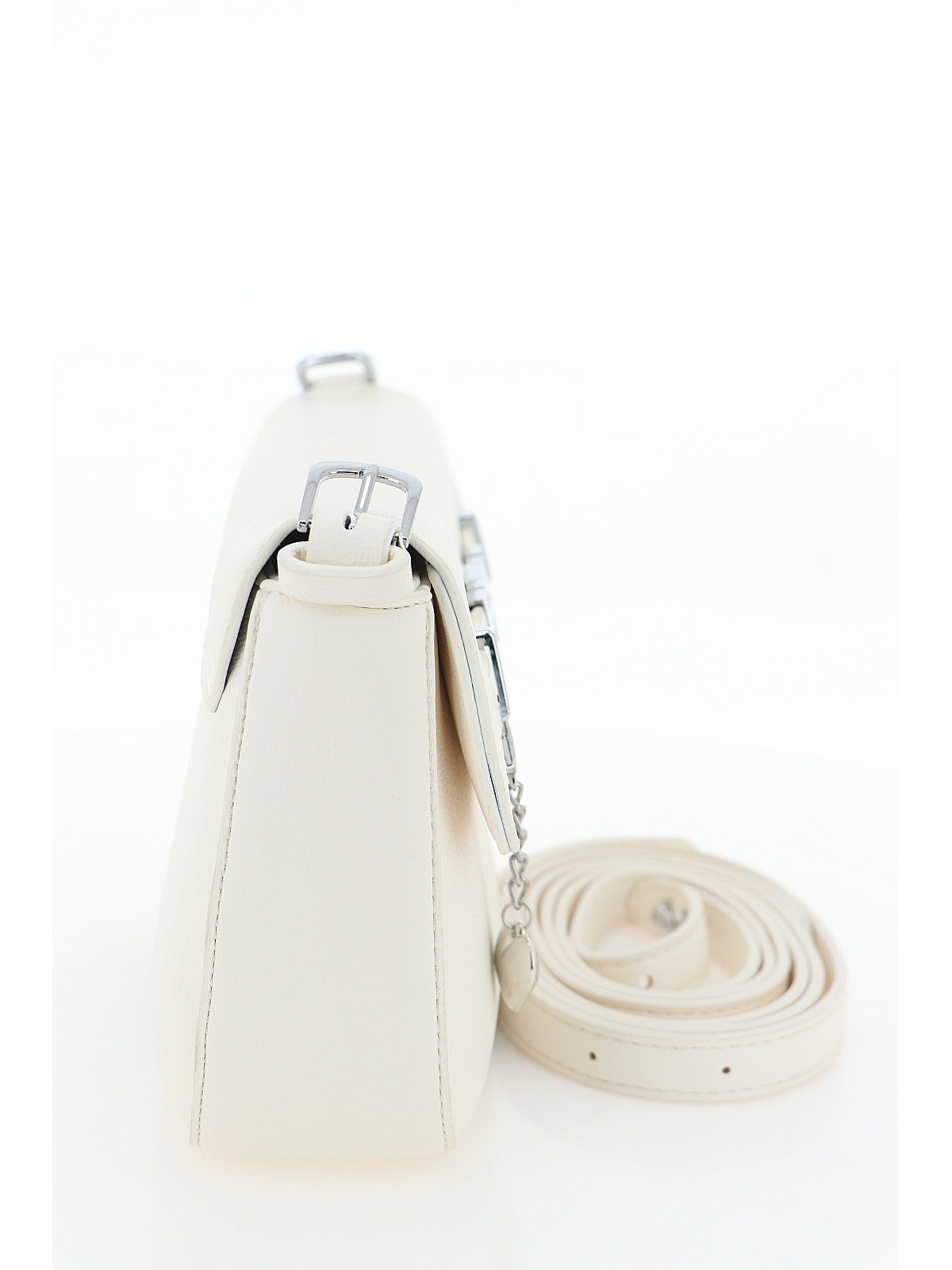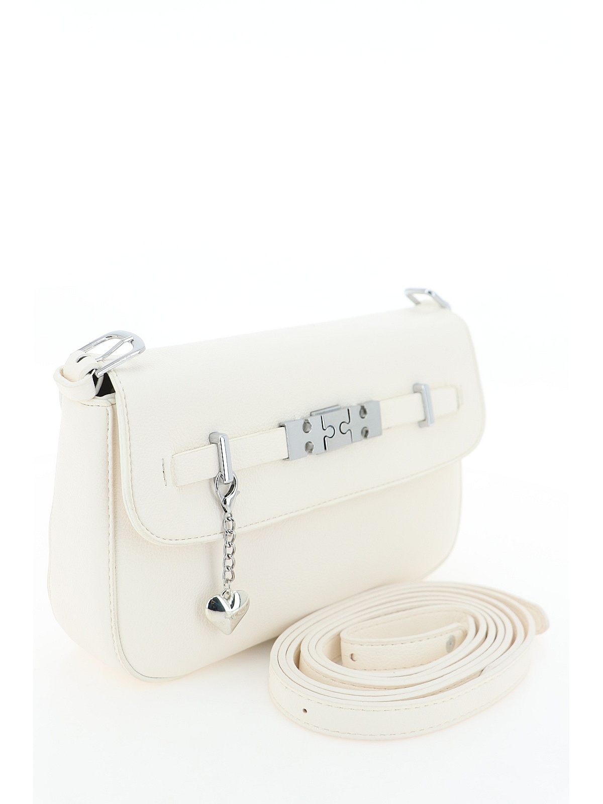 Сумка BADEN белого цвета — аккуратная, с мягким прямоугольным силуэтом и чуть скруглёнными нижними уголками. Гладкая искусственная кожа приятна на ощупь, внутри — текстильный подклад. На лицевой стороне — ремешок, продетый в металлические петли, а на прямоугольной пряжке — небольшие декоративные пазлы. Рядом — брелок-сердечко на тонкой цепочке. Длинный ремень из той же кожи позволяет носить сумку на плече. Спокойный белый оттенок, неожиданные детали и мягкая форма — для летних дней и повседневных образов. оптом в Тюмени